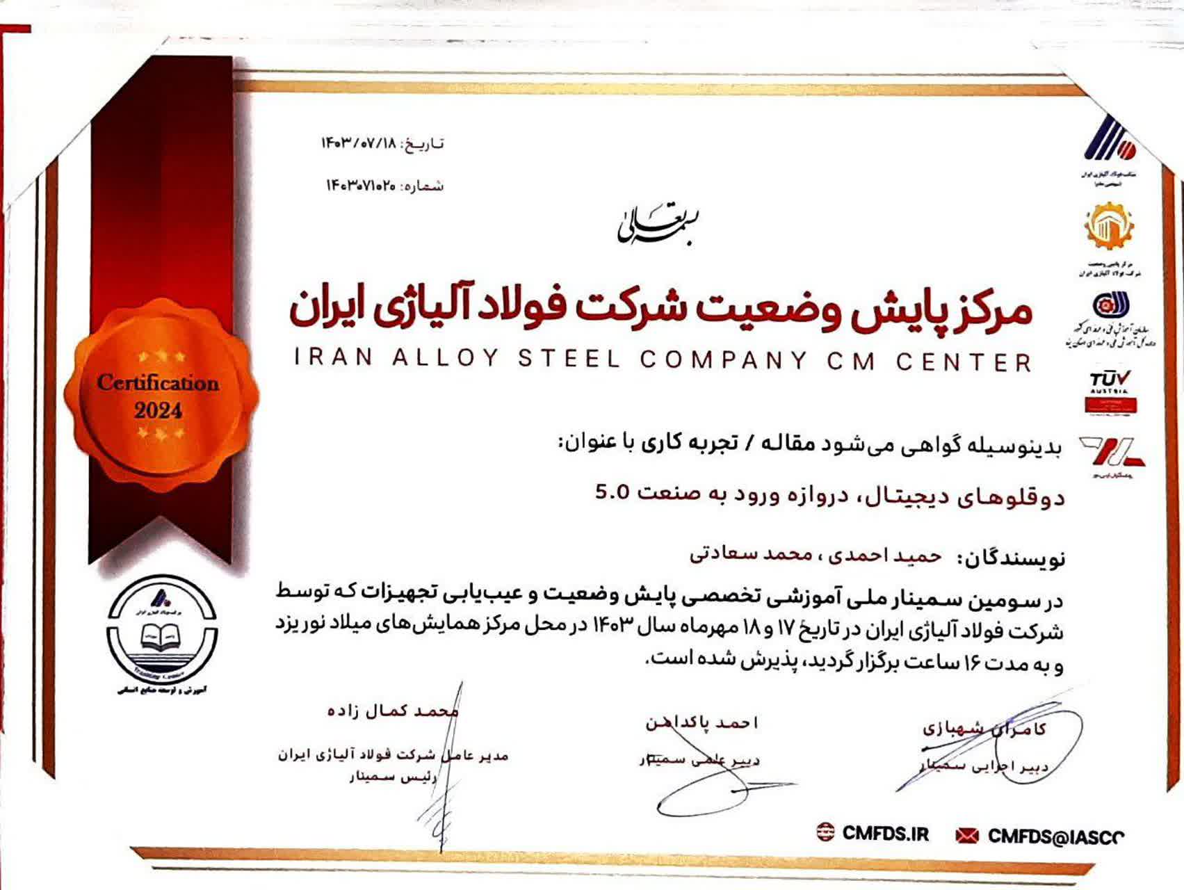 دوقلوهای دیجیتال، دروازه ورود به صنعت 5.0: دوقلوهای دیجیتال، دروازه ورود به صنعت 5.0 عنوان مقاله ای است که در سومین سمینار ملی پایش وضعیت و عیب یابی تجهیزات توسط متخصصین شرکت آلومینای ایران ارائه و مورد توجه و دیدگاه مثبت شرکت کنندگان و تقدیر برگزار کنندگان سمینار قرار گرفت.