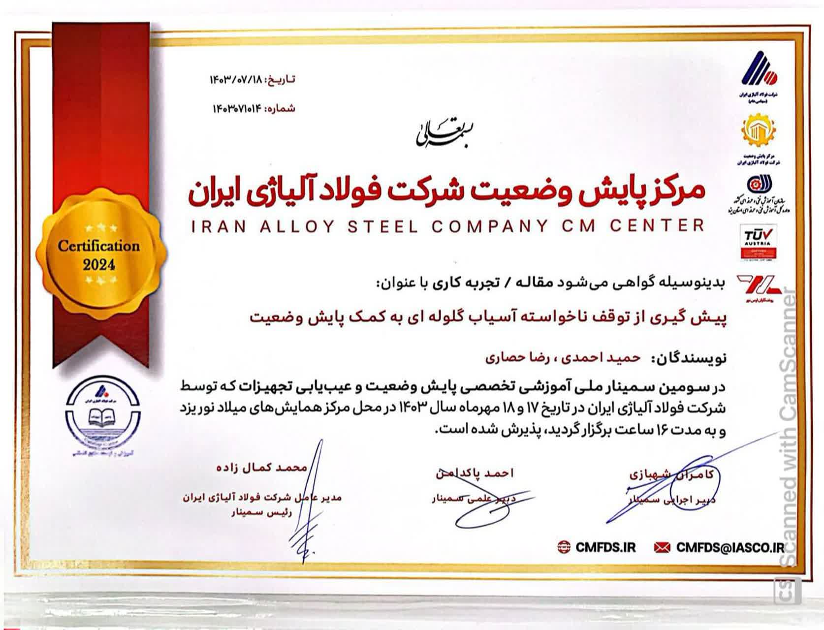 با ارائه مقاله پیشگیری از توقف ناخواسته آسیاب گلوله ای به کمک پایش وضعیت در سومین سمینار ملی پایش وضعیت و عیب یابی تجهیزات تاکید شد:لزوم هوشمندسازی در پایش وضعیت و عیبیابی تجهیزات